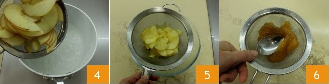 Cuando el agua haya alcanzado el punto de ebullición, añade las manzanas y hiérvelas durante 1 minuto, hasta que se ablanden sin deshacerse. Luego apaga el fuego, escúrrelas 5 y déjalas enfriar. En este punto, puedes colar la mermelada de albaricoque para hacerla más cremosa (es un paso opcional) 6.