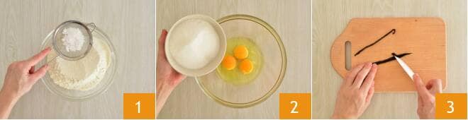 Para preparar la rosquilla de dos chocolates, primero tamizad en un bol la harina y luego la levadura para postres 1. Tomad los huevos y ponedlos en un bol y añadid el azúcar 2. Tomad la media vaina de vainilla y con un cuchillo sacad las semillas raspándolas de la vaina 3.