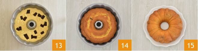 y añadid otros 40 g de chocolate negro y otros 40 g de chocolate blanco 13. Hornead a 180° durante 45 minutos. Luego, sacadla del horno 14, dejadla enfriar, luego retiradla del molde y transferidla a un plato para servir.
