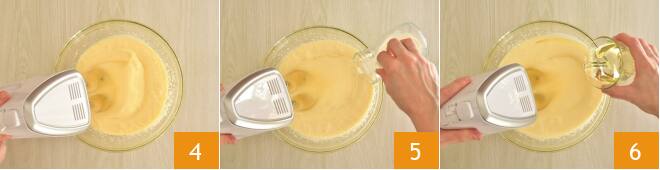 Incorporadlas al bol con huevos y azúcar y comenzad a batir con una batidora hasta obtener una mezcla espumosa y clara 4. Añadid en hilo primero la leche a temperatura ambiente 5 y luego el aceite reduciendo la velocidad 6.