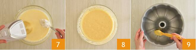 Incorporad poco a poco la harina mezclada con la levadura continuando a batir a baja velocidad 7, deberéis obtener una mezcla lisa y sin grumos 8. Engrasad un molde para rosquillas de 26 cm de diámetro 9
