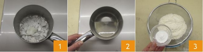 Para preparar las rosquillas de coco y frutos rojos, primero pon el aceite de coco en un cazo 1 y derrítelo a fuego lento solo el tiempo necesario para que se vuelva líquido 2. Mientras tanto, tamiza la harina y la levadura en un bol aparte 3.