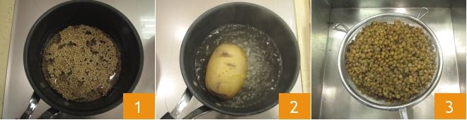 Para preparar el rosti de lentejas con rape, primero prepara la masa para los rosti: pon las lentejas en una olla y cúbrelas con agua, enciende el fuego y cocina durante unos 20 minutos 1, cuidando que las lentejas no se deshagan sino que queden bastante crujientes. Pon la patata en otro cazo lleno de agua y hiérvela hasta que esté blanda 2. Una vez pasado el tiempo de cocción, escurre las lentejas y déjalas momentáneamente a un lado 3.