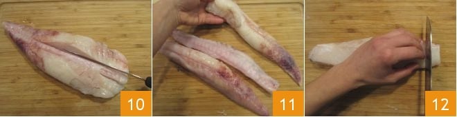 Toma el rape y divídelo por la mitad a lo largo, cortando a lo largo de la espina central 10 para obtener 2 filetes 11. De cada filete saca medallones de un grosor de aproximadamente 3 cm (el diámetro varía según el tamaño del filete) 12