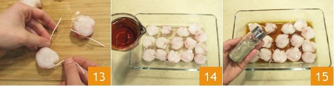 y ata cada medallón con un trozo de cuerda para que mantenga la forma durante la cocción 13: en total necesitarás 12 pequeños medallones. Transfiere los medallones de rape a una fuente, vierte el Marsala dentro 14 y sazona con sal y pimienta 15, luego deja marinar durante unos 10 minutos.