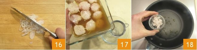 Mientras tanto, pela y pica finamente la chalota 16. Pasados 10 minutos, escurre la marinada del pescado filtrándola con un colador 17, luego sofríe la chalota en una sartén con muy poco aceite 18,