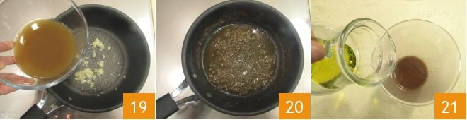 añade el líquido de la marinada 19 y déjalo reducir a fuego lento durante unos 5 minutos 20. Transfiere la salsa resultante a un recipiente alto y estrecho, añade el aceite 21,