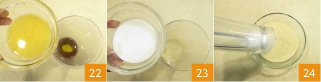 el zumo de naranja 22 y la nata fresca 23 y bate con una batidora de inmersión. Ajusta la salsa de sal 24 y mantenla caliente hasta el momento de su uso.