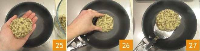 Ahora puedes pasar a cocinar los rosti: toma una cucharada abundante de masa y dale forma con las manos para darle forma de una especie de hamburguesa 25, luego colócala en una sartén caliente sin añadir aceite 26 y cocina hasta que esté bien dorada por ambos lados 27; tardarás unos 10 minutos en cocinar los 6 rosti. Una vez cocidos, pon los rosti a un lado manteniéndolos calientes, quizás en el horno.