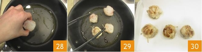 En cuanto a la cocción del pescado, calienta un poco de aceite de oliva en una sartén, coloca los medallones dentro 28 y dóralos a fuego medio durante un par de minutos por lado 29, luego transfiérelos a un papel absorbente para secarlos del exceso de aceite 30.