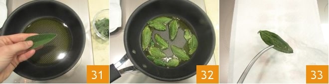 Por último, ocúpate de las hojas de salvia para la decoración: calienta un dedo de aceite de oliva en una sartén, añade las hojas 31 y fríelas durante un par de minutos hasta que estén crujientes 32, luego transfiérelas a un papel absorbente para eliminar el exceso de aceite 33.