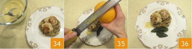 Ahora estás listo para montar tu entrante: coloca un rosti en cada plato, pon encima 2 medallones de rape, a los que habrás quitado la cuerda, y sazona con una cucharada de salsa 34. Finalmente, decora con 2 hojas de salvia crujiente, cáscara de naranja rallada 35 y una molienda de pimienta: ¡tus rosti de lentejas con rape están listos para servirse 36!