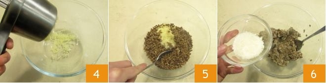 Tritura la patata hervida en un bol 4, añade las lentejas y mezcla 5, luego incorpora el Parmesano rallado 6,