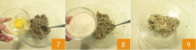 el huevo 7, el pan rallado 8, sal y pimienta. Mezcla hasta obtener una masa consistente y homogénea 9 y déjala a un lado.