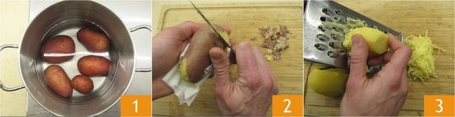 Para preparar el rosti, lo primero que tienes que hacer es poner las patatas en una olla con abundante agua fría, llevar a ebullición y cocer durante unos 10-15 minutos 1; el tiempo varía según el tamaño de las patatas, deberán estar muy al dente. Después de escurrirlas, pela las patatas 2 y rállalas en un bol grande con un rallador de agujeros grandes 3; para esta operación, las patatas deben estar frías o tibias.