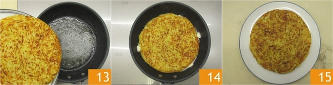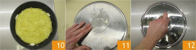Añade unos trocitos de mantequilla a los lados del rosti y sigue cocinando durante 6-7 minutos, sin mezclar 10. En este punto, engrasa con mantequilla una tapa ancha y plana 11 y colócala sobre la sartén para voltear el rosti 12.