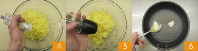 Condimenta las patatas ralladas con sal 4 y pimienta 5 y mezcla bien. Ahora toma una sartén antiadherente de 22 cm de diámetro, añade una parte de la mantequilla tomada de la dosis total 6 y derrítela.