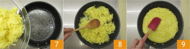 Vierte las patatas ralladas en la sartén 7 y mezcla durante unos 5 minutos a fuego medio-alto, comenzando a dar forma al rosti con una espátula 8 9.