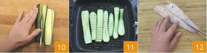 Pasa ahora a los calabacines: lávalos y córtalos en rodajas muy finas a lo largo 10, luego ásalos unos minutos por cada lado en una plancha caliente 11. Procede ahora con la formación de los rollitos. Primero realiza un corte vertical al centro de cada filete, para obtener de cada uno 2 filetes más estrechos 12.