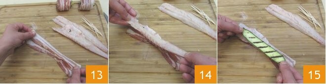 Coloca sobre la tabla de cortar, una encima de la otra, 3 lonchas de panceta 13 y coloca encima un filetito 14. Encima del filetito coloca finalmente una rodaja de calabacín asado 15.