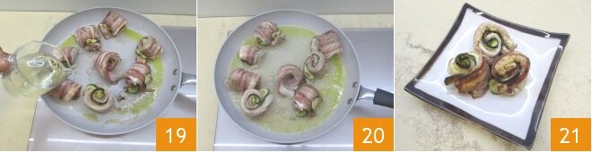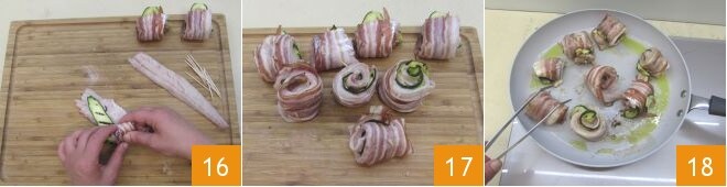 Enrolla la panceta, el filetito y el calabacín sobre sí mismos para formar tus rollitos 16 y fíjalos con un palillo para evitar que se abran 17. Calienta el aceite en una sartén amplia antiadherente y, cuando esté bien caliente, coloca los rollitos para dorar durante 2-3 minutos, girándolos a menudo por todos los lados con la ayuda de un par de pinzas 18.