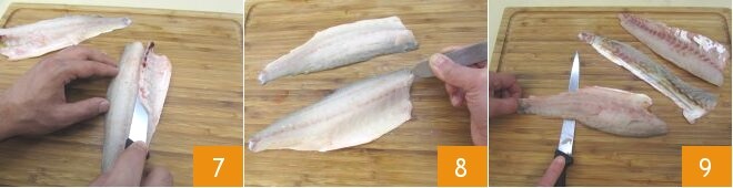 Gira el pescado y repite el procedimiento en el otro lado para obtener también el segundo filete. Con un cuchillo afilado elimina la parte central y rojiza de los filetes 7 y con las pinzas adecuadas elimina las espinas restantes 8. Manteniendo el cuchillo horizontal, separa finalmente la pulpa de la piel 9. Repite con la segunda lubina para obtener también de ella 2 filetes sin piel.