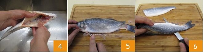luego lava cuidadosamente bajo agua corriente para eliminar sangre y eventuales residuos 4. Trasládalo de nuevo a la tabla de cortar, elimina la cabeza 5 y luego, manteniendo el cuchillo paralelo a la superficie de trabajo, realiza un corte profundo a lo largo de la espina dorsal de la lubina, cerca de la espina, para separar el primer filete 6.