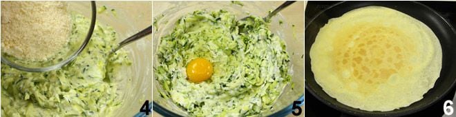 Para preparar el rollo de crepes con calabacines, comienza lavando, cortando los extremos y rallando los calabacines con un rallador de agujeros grandes 1; luego exprímelos bien ayudándote con un colador 2 y colócalos en un bol. Añade entonces el queso Philadelphia 3 y la bechamel que habrás preparado con las cantidades indicadas arriba y siguiendo el procedimiento que encuentras Bechamel