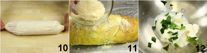 Sobre un papel de horno engrasado coloca las crepes superponiéndolas un poco para formar un rectángulo 7, unta la mezcla de calabacines y Philadelphia en el centro del rectángulo 8 y enrolla las crepes ayudándote con el papel de horno 9
