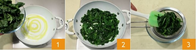 Para los rusticos de espinacas: lavad las espinacas con cuidado bajo agua corriente. Salteadlas durante unos 10 minutos en una sartén con el aceite 1. Cuando se hayan marchitado 2, escurrid el exceso de agua de vegetación 3.