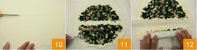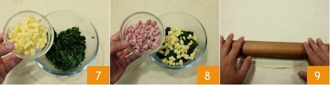 Luego, en un bol, verted las espinacas y añadid el queso y el jamón cocido (7-8), mezclad y reservad; extendéd la masa de hojaldre 9.
