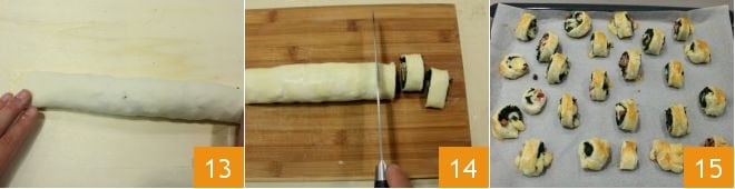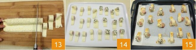 y 10 con las blancas 13; cuando hayáis terminado, poned los rusticos con salchicha en el congelador por 5 minutos 14. Después, horneadlos en horno estático precalentado a 180° durante unos 20-25 minutos (si es horno ventilado a 160° durante unos 10-15 minutos); una vez cocidos 15 sacadlos del horno, servidlos calientes o tibios.
