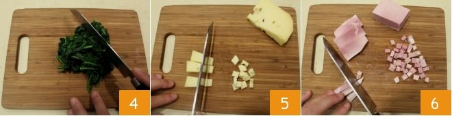 y picadlas con un cuchillo 4, luego reservadlas. Al final, escurridlas y picadlas finamente; cortad el queso ahumado en rodajas, mientras que el Emmental y el jamón cocido en dados (5-6).