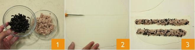 Para preparar los rusticos, comenzad con los de atún y aceitunas: escurrid el atún del aceite de conservación; luego trituradlo y ponedlo en un bol pequeño. Añadid las aceitunas negras deshuesadas y picadas 1, luego dividid el disco de masa de hojaldre por la mitad 2 y rellenad una mitad con el relleno de atún y aceitunas distribuido en dos tiras ligeramente separadas 3.