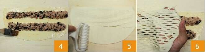 pincelad con la emulsión de yema y leche la parte del hojaldre que quedó descubierta 4; pasad el rodillo de rombos sobre la otra mitad de hojaldre 5, luego colocadla sobre la mitad con el relleno 6,