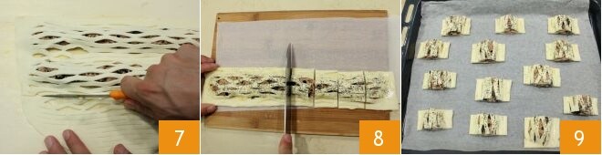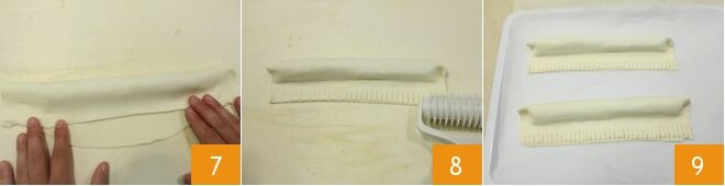 presionando con los dedos 7; cortad el exceso de masa, dejando 2-3 cm del relleno. Luego pasad el rodillo de rombos sobre la parte sin relleno 8 y reservad en el frigorífico por al menos 20 minutos 9.