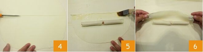 divididla en dos mitades 10 y rellenadlas con el relleno dejando aproximadamente 1,5 cm del borde 11. Pincelad con la emulsión de yemas y leche y enrollad sobre sí misma cada mitad 12.