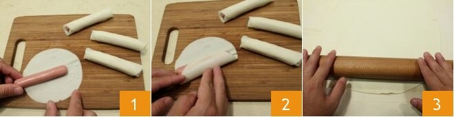 dividid el hojaldre por la mitad 4 y colocad dos rollitos de salchicha y queso ahumado en la parte del corte; pincelad con la emulsión de yemas y leche alrededor del relleno 5; cerrad 6.
