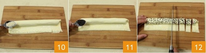 Pincelad luego la superficie con la emulsión de yemas y leche y espolvoread un tronquito con semillas de sésamo blancas 10 y uno con las negras 11; Luego, proceded a cortarlos en piezas de un grosor de aproximadamente 2 cm: obtendréis unos 10 con semillas negras 12.