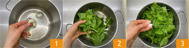 Para preparar el rústico ricotta y espinacas, lo primero que hay que hacer es poner en una cazuela la mantequilla y el ajo 1. Cuando la mantequilla se haya derretido, añadir las espinacas 2 y ajustar de sal 3.