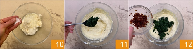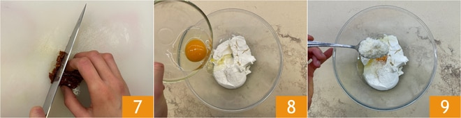 Picar también los tomates secos 7. En un bol poner la ricotta, añadir el huevo 8 y el Grana 9.