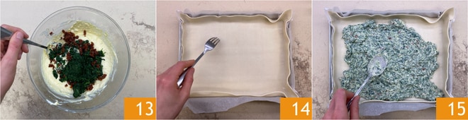 Mezclar bien 13 para amalgamar todos los ingredientes. Colocar el hojaldre, con su papel de horno, dentro de un molde de 30x23 cm, de modo que se adhiera bien al fondo y a los bordes. Pinchar el fondo con los dientes de un tenedor 14. Añadir el relleno y nivelar 15.