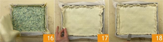Cubrir con otro rollo de hojaldre 16 y doblar los bordes hacia afuera 17, luego sellarlos con los dientes de un tenedor 18.