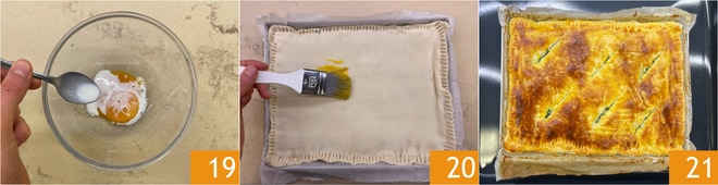 En un bol pequeño batir la yema con una cucharada de leche 19 y pincelar el rústico con esta mezcla 20. Hacer cortes en la superficie para crear una salida de vapor que se formará durante la cocción. Cocinar en horno estático a 200°C durante 25-30 minutos. Tu rústico ricotta y espinacas está listo para ser disfrutado 21.