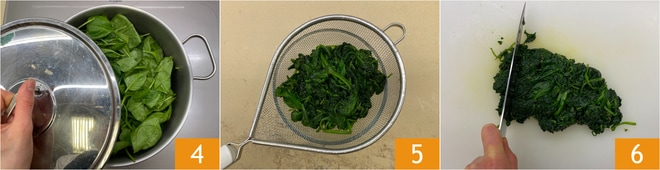 Cubrir con la tapa 4 y cocinar a fuego lento durante 5 minutos. Dejar enfriar en un colador y exprimir las espinacas 5, luego picarlas con un cuchillo 6.