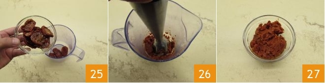 Prepara el paté de tomates secos. Coloca los tomates secos en un recipiente alto 25 y tritura todo con una batidora de mano 26, hasta obtener una crema 27.