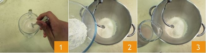Para preparar los sacotillos salados, lo primero que debes hacer es realizar la masa de hojaldre. Disuelve la levadura en agua a temperatura ambiente 1. En una batidora con gancho, vierte las dos harinas 2, luego agrega la levadura disuelta en el agua 3
