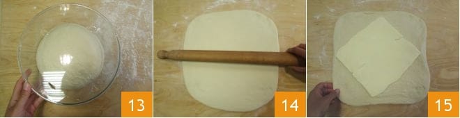 Al final de la fermentación 13, transfiere la masa a una superficie enharinada y con el rodillo, extiéndela para obtener un cuadrado de 30x30 cm 14. Luego coloca el bloque de mantequilla en el centro del cuadrado para formar un rombo 15.