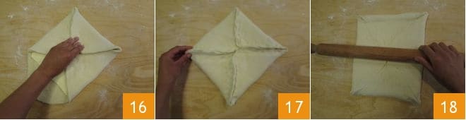 Luego dobla los extremos de la masa inferior hacia el centro del bloque de mantequilla 16, haciendo que se junten los bordes pero sin superponerlos. Sella los extremos con las manos 17. Deja reposar en el frigorífico durante 10-15 minutos. Vuelve a colocar el cuadrado obtenido en una superficie ligeramente enharinada y extiéndelo hacia uno de los lados 18.