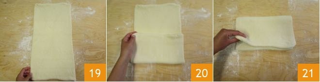 Estíralo para alargar solo uno de los lados 22 hasta obtener un rectángulo de 44 cm de largo y medio cm de espesor 19. Luego haz el primer pliegue a 3 llevando un borde de masa a 1/3 del rectángulo 20. Luego cubre con el otro borde 21. El primer pliegue está listo. Cubre con film transparente y deja reposar al menos 30 minutos en el frigorífico.